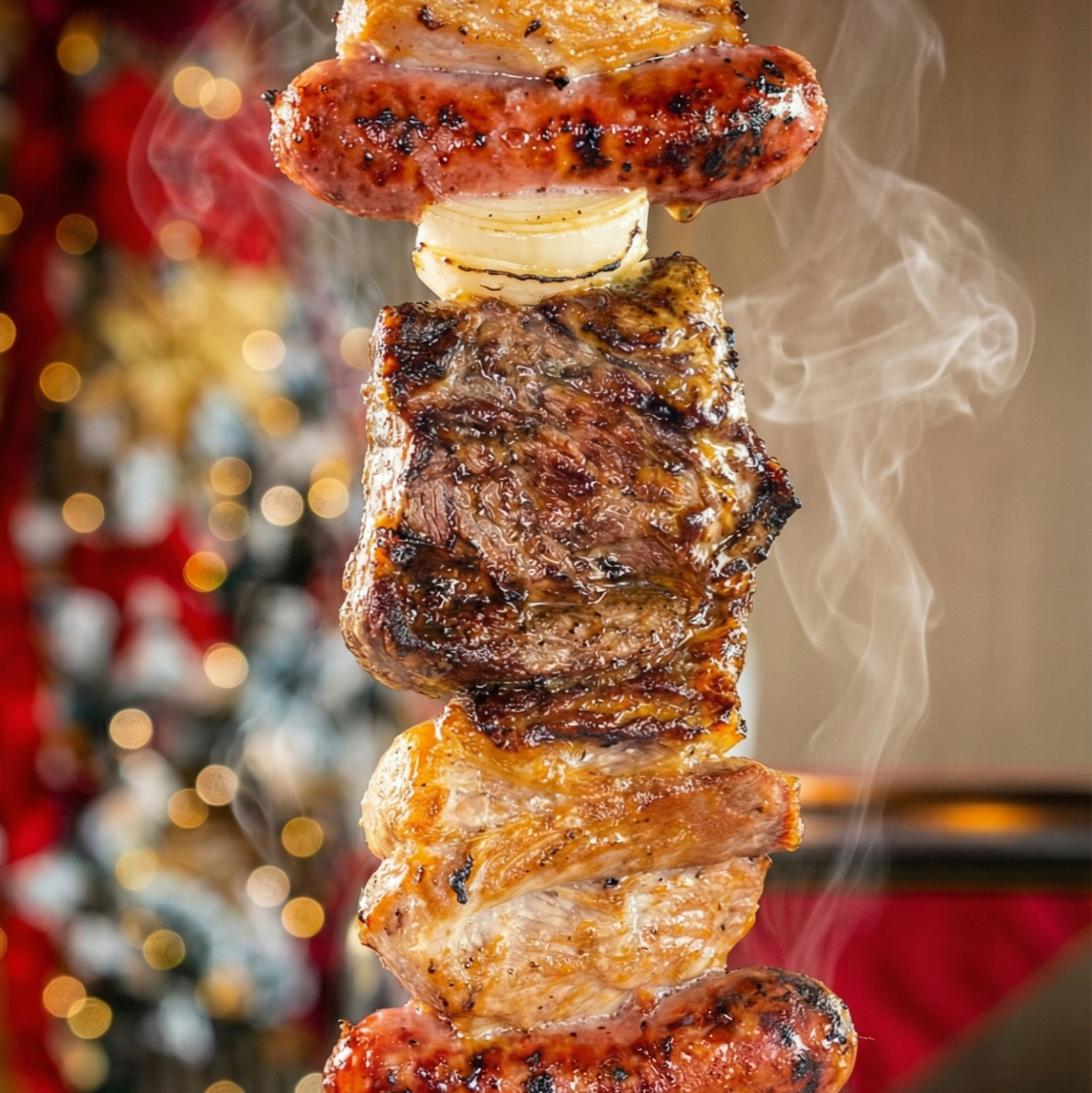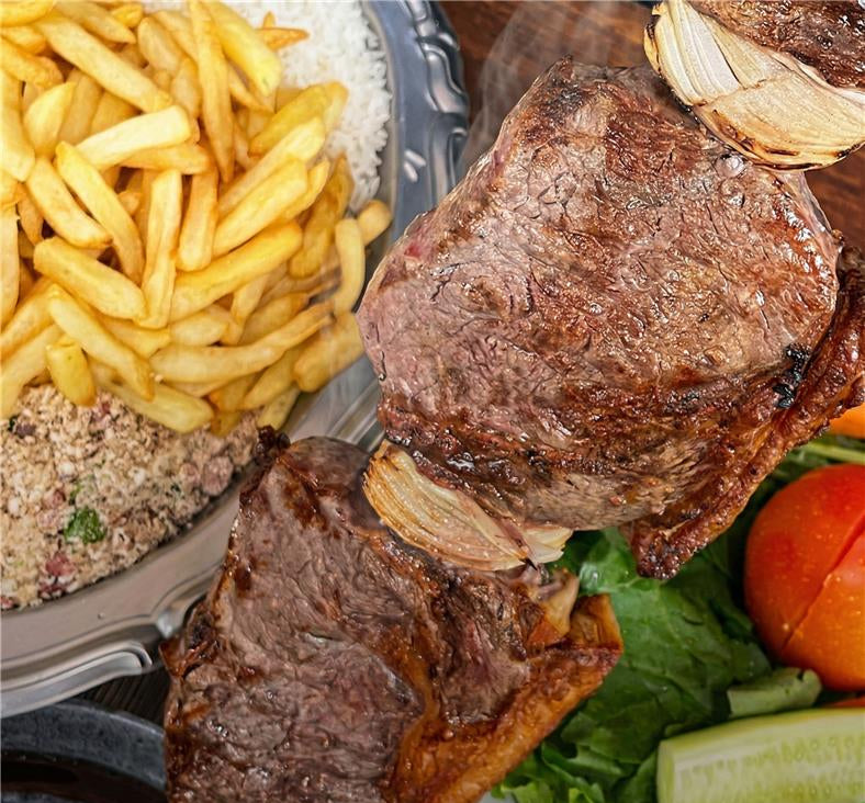 Espetos Mistos: à Gaúcha (contrafilé argentino, frango e linguiça) ou ao Costelão (contrafilé argentino, lombo suíno e linguiça).